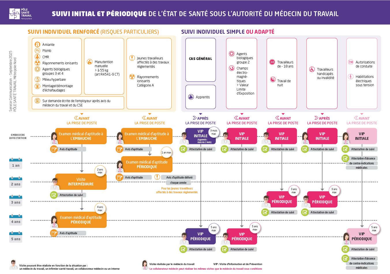 Le travailleur bénéficie d’un renouvellement de la visite d’information et de prévention initiale, réalisée par un professionnel de santé (infirmier du travail, interne en médecine du travail et médecin du travail) selon une périodicité qui ne peut excéder cinq ans.